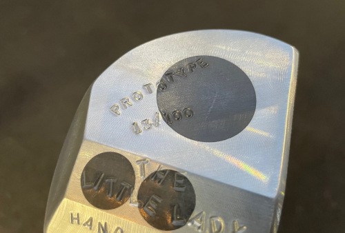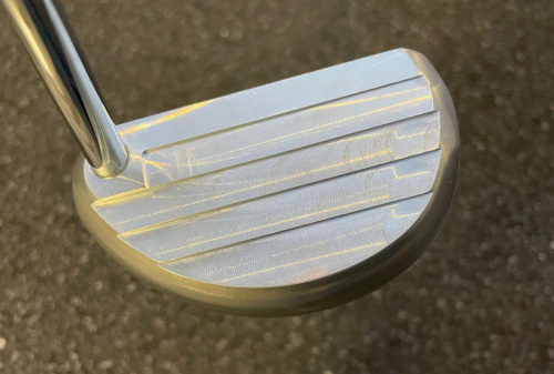 このパターの特徴はアルミ製のヘッドにトウ/ヒールにウェイトを入れて安定させているところ。そしてアルミの打感の柔らかさが独特です。