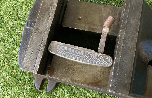 欲しかったのは開口部が広いバイスです。なぜこれが必要かというと、画像のようにパターヘッドを縦に挟めるんです。