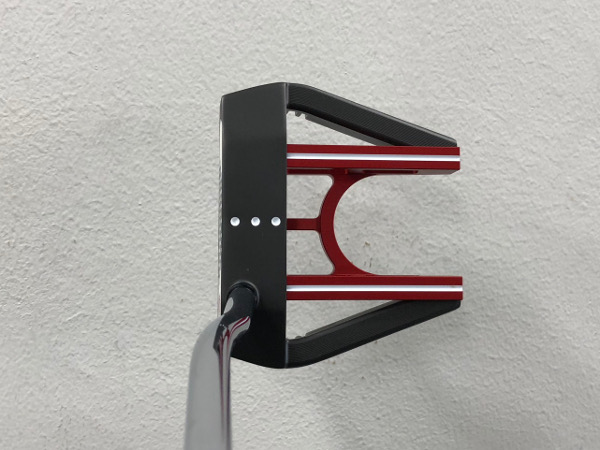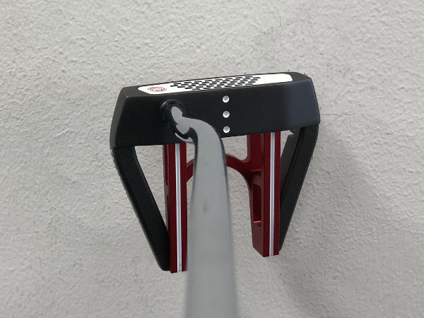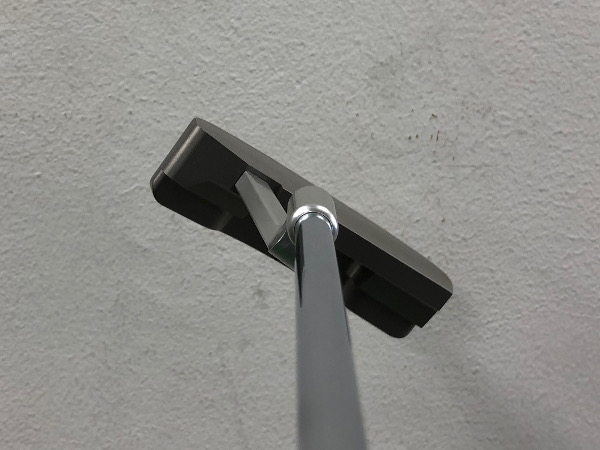 まずアドレスした形を目の高さで再現してみると、こんな形になります。これがバックストロークのように横に動くと、トウ側が下の方に向かおうとします。その行きたがる度合いがそのパターの重心角によって変わってきます。