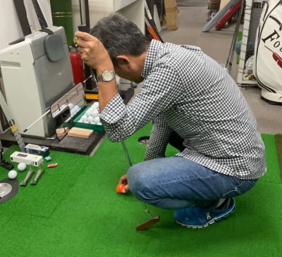 これの悪いところは頭がボールの位置にあるところです。これだとボールのラインを合わせる時に「ボールを見て⇔カップを見て」をやろうとすると頭の角度を変えなければなりません。