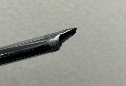 なんとシャフト先端が斜めにカットされています。斜めに刺さった状態で大量の接着剤で固められて止まっていました。