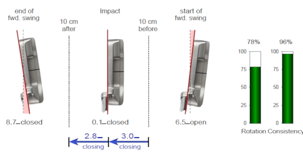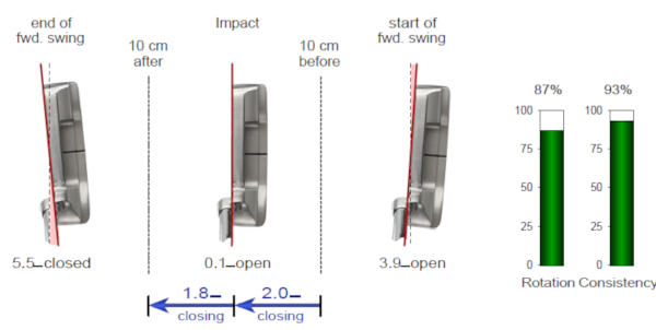これが3mの距離のフェースローテーションで、テークバックが終わった時のフェースの開きが6.5度、インパクトではほぼ真っ直ぐの0.1度オープンでした。そしてインパクト前10cmと、インパクト後10cmのクローズの動きは前が3度、後が2.8度とほぼ同じ。
