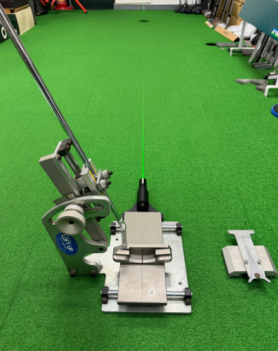 まず左目の下にボールを置いていることをミラーで確認して、フェースの向きを 3m 先のカップ方向に向いていることをレーザーで確認。