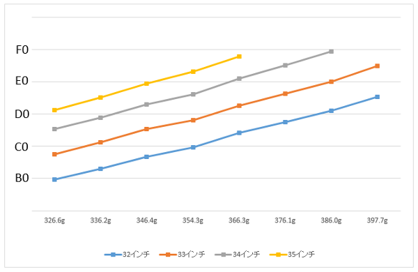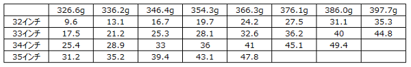になっていますので、33インチの時は全くバランスが出ていないことになっています。33インチでD5程度のバランスを出すには370gくらいの重量が必要になります。