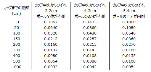 とこんな数値になります。先日も言ったようにボールがカップの内側に3/4入っていても強ければ入らないこともありますので、その辺は考慮してください。