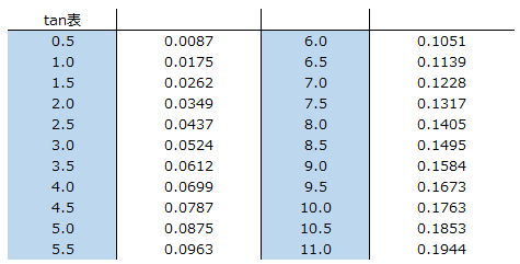 ここで出てきた数値を今度はタンジェント表を見てみるとこうなっています。