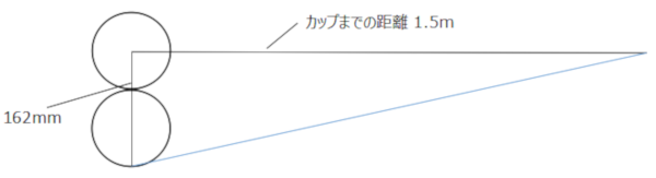 実際のカップの中心から縁までの距離は108mmの半分の54mm。そこからさらに1カップなので、プラスカップの直径の108mmになるので、1カップ左までの距離は162mmになります。