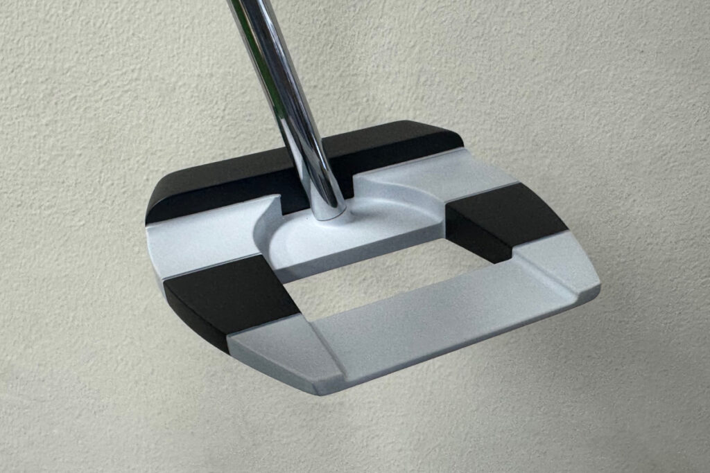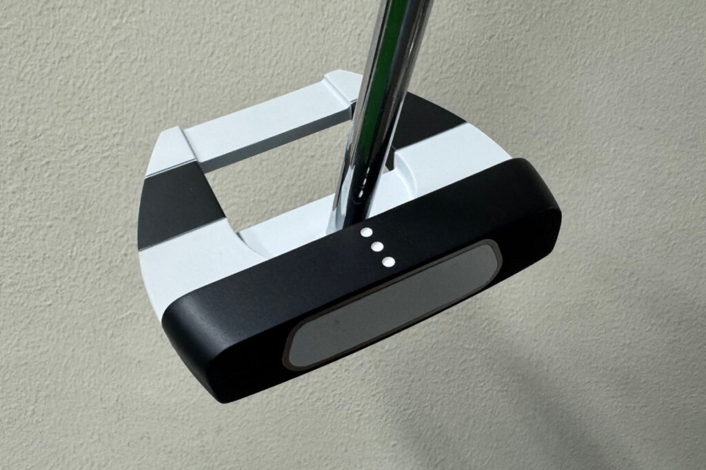 このパターハンドファーストに構える方には違和感なくできるのですが、シャフトを垂直に構えたい人はとってもすわりが悪く構えにくいパターですよね。